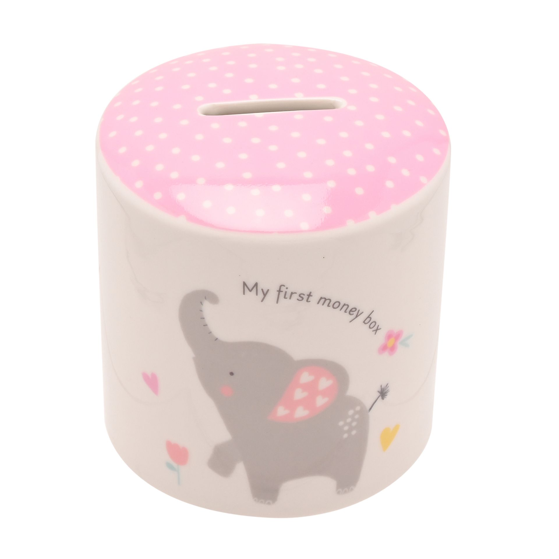 Uit de collectie van Hello baby een spaarpot van keramiek met de afbeelding van een olifantje, hartjes en bloemetjes in het roze.